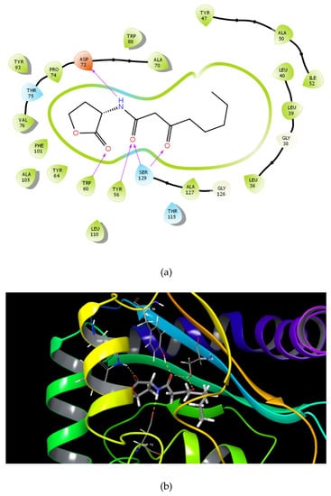 | 3OC12-HSL | ![]() | −6.456 | 5 | Tyr 56 Trp 60 Asp 73 Ser 129 (2) |