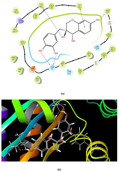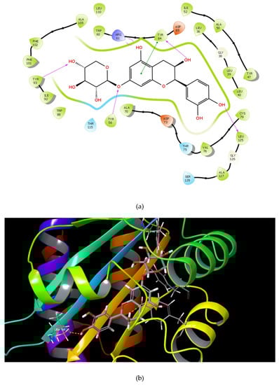 | Catechin 7-xyloside (C7X) | ![]() | −13.508 | 4 | Tyr 56 Tyr 64 Tyr 93 Leu 125 |