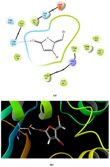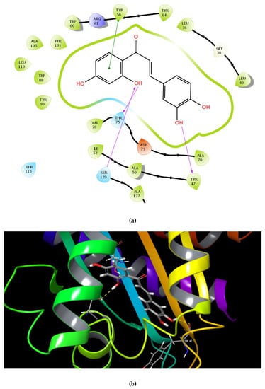 | Butein | ![]() | −9.245 | 3 | Tyr 47 Thr 75 Ser 129 |
