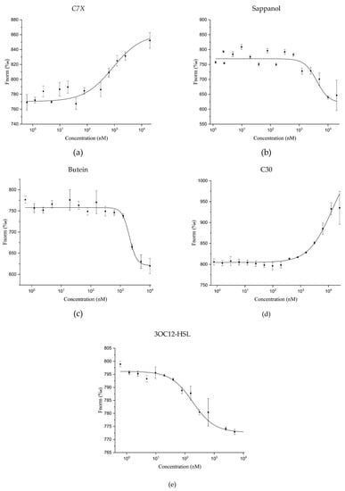 - Zou, Y.; Nair, S.K. Molecular basis for the recognition of structurally distinct autoinducer mimics by the Pseudomonas aeruginosa LasR quorum-sensing signaling receptor. Chem. Biol. 2009, 16, 961–970. [Google Scholar] [CrossRef] [PubMed]