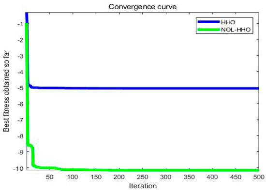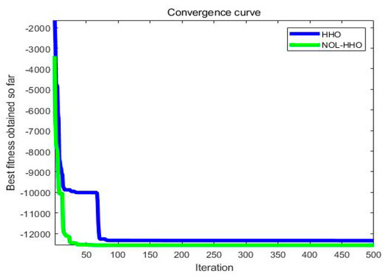 As can be seen from Table 1, for the unimodal benchmark functions (F1–F7), the mean or standard deviation test results of the NOL-HHO algorithm were significantly better than for other algorithms, and functions F1–F4 reached a global optimal value in Table S1, indicating that the improved algorithm had a stronger benchmark exploitation capability. In terms of multi-dimensional function testing (F8–F13), NOL-HHO also showed superior performance as compared with HHO and other algorithms. The mean and standard deviation of F9–F11 reached global optimal values, as shown in Table S2. The mean of the remaining functions of NOL-HHO were closer to the optimal value, and the standard deviation was more stable as compared with the other algorithms. This shows that it had a strong exploration capability. For fix-dimension multimodal benchmark functions (F14–F23), it can be seen from Table 2 that the mean was better, except for the function F20 and the global optimality reached 90%. Functional tests of this different type of problem illustrate the superiority of the overall performance of the NOL-HHO algorithm.