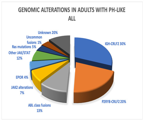 Genomic alterations in adults with Ph-like acute lymphoblastic leukemia (ALL). Pie chart constructed with data from Roberts et al. [67].