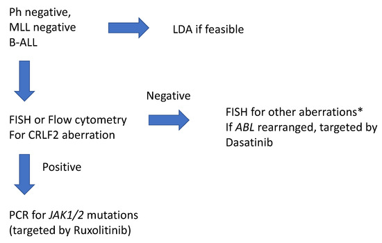 A 15 gene (IGJ, SPATS2L, MUC4, CRLF2, CA6, NRXN3, BMPR1B, GPR110, CHN2, SEMA6A, PON2, SLC2A5, S100Z, TP53INP1, IFITM1) low density array (LDA) classifier developed by Harvey et al. [71] was able to predict Ph-like ALL with high sensitivity (93%) and specificity (89%). The same group also developed an 8-gene assay (JCHAIN, SPATS2L, CA6, NRXN3, MUC4, CRLF2, ADGRF1, BMPR1B) to identify Ph-like ALL with targetable kinase gene aberrations [32] and generated an integrated score between 0 and 1, with a score of ≥ 0.5 being predictive of Ph-like ALL. LDA can be used as a screening test to identify Ph-like ALL and further characterization can be done with FISH, RT-PCR, and flow cytometry.