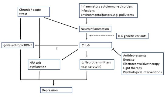 The etiology of major depressive disorder (MDD) is complex, with psychological, biological as well as environmental components. Cytokines, which are a heterogeneous group of polypeptides, may be the key players in the immune activation which has been repeatedly described in MDD and stress reactions []. Active transport systems may carry peripherally released cytokines from blood into the brain. Via a feedback mechanism, activated glia cells can produce cytokines []. Neurotransmitters, especially the monoaminergic systems that are thought to play a pivotal role in MDD are affected by the cytokines inside the brain []. As the production of the cytokines interleukin-6 (IL-6), tumor necrosis factor-alpha and interleukin-1 is associated with initiation of an inflammatory response, these cytokines are often referred to as pro-inflammatory cytokines. Implicated in the pathophysiology of MDD, these cytokines out of the activating cytokines are most relevant in terms of their actions on the brain [,,].