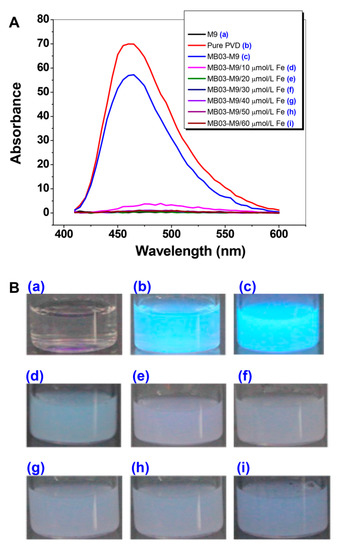 To verify the function of iron in the production of PVD, P. syringae MB03 cells were grown with or without exogenous iron supplementation at concentrations ranging from 10 to 60 µmol L−1. The diluted supernatants produced absorbed light from 450 nm to approximately 600 nm, with the highest peak at 460 nm. As shown in Figure 2, PVD was produced under conditions of no or low levels (10 µmol L−1) of iron supplementation, indicating that PVD is only produced by MB03 under iron-limiting conditions. This result is consistent with that of a previous investigation by Yin et al. [35]. Based on these results, we considered that 20 µmol L-1 of iron would be a crucial dose for PVD production in MB03.