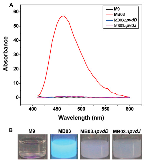 PVD production in P. syringae MB03 and the mutants MB03∆pvdD and MB03∆pvdJ: (A) Wavelength-scanning curves of the supernatants from the ∆pvdD and ∆pvdJ mutant strain culture suspensions and (B) fluorescence of P. syringae MB03, MB03∆pvdD, and MB03∆pvdJ cell suspensions. M9 was used as the negative control.