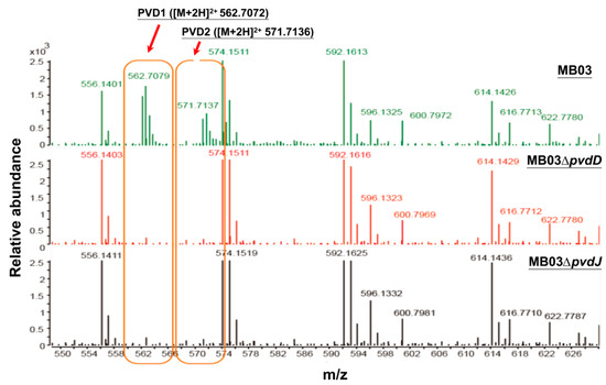 Liquid chromatography-mass spectrometry (LC-MS) analysis of cell free filtrates of MB03, MB03∆pvdD, and MB03∆pvdJ: MB03 and its derivatives were grown in M9 media for 48 h.