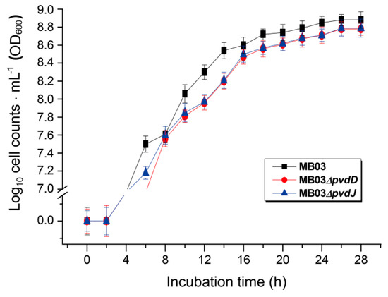 The growth curves of P. syringae MB03 and the mutant strains MB03∆pvdD and MB03∆pvdJ: MB03 and its derivatives were grown in M9 media for 28 h.