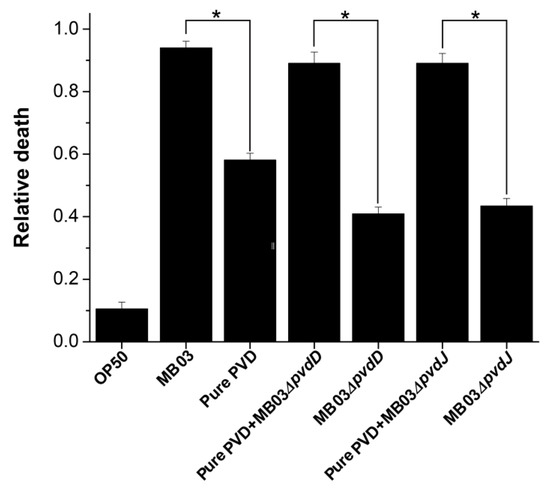 To determine whether PVD is associated with the nematocidal activity of P. syringae MB03 against free-living nematode C. elegans [32], we performed an LK bioassay to evaluate C. elegans mortality using cell-free filtrates of the wild-type MB03 strain and both mutants (MB03∆pvdD and MB03∆pvdJ) strains, which are unable to produce PVD under iron-limiting conditions. In addition, the commercially available pure PVD was assayed at a normalized dose that was comparable with that of the PVD produced by MB03 after 48 h. As shown in Figure 6, the filtrate from MB03 exhibited the highest nematocidal activity, while the pure PVD also showed substantial nematocidal activity. Not unexpectedly, the nematocidal activity of the filtrates from both the MB03∆pvdD and MB03∆pvdJ mutants was remarkably decreased compared to that of MB03. However, the nematocidal activity of both mutants was restored to a level that was similar to that of the parent strain when an almost equivalent amount of pure PVD was added to compensate for the lack of PVD in the mutant filtrates. Thus, these results indicate that the PVD from P. syringae MB03 is responsible for the observed mortality of the worms and functions as a nematocidal virulence factor against C. elegans. Moreover, the observation that the nematocidal activity of the filtrates from both mutants was not completely lost indicated the presence of additional virulence factors in addition to PVD.
