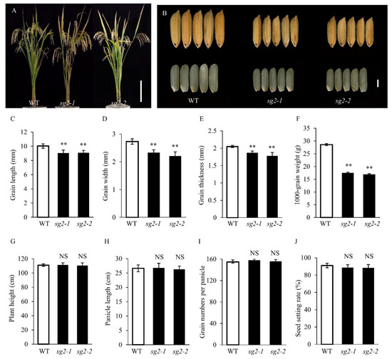 Phenotypic analysis of sg2 mutants. (A) Plant comparison of wild-type (WT), sg2-1, sg2-2 at the maturity stage. Bar = 20 cm. (B) Morphology of grain shape in WT, sg2-1, sg2-2. Bar = 2 mm. Statistical data of the grain length (C), grain width (D), grain thickness (E), 1000-grain weight (F), plant height (G), panicle length (H), grain numbers per panicle (I), and seed setting rate (J) in WT and sg2 mutants. Data are given as means ± SD. Student’s t-test was used to generate the p values; ** and NS indicate p < 0.01 and no significant differences, respectively.