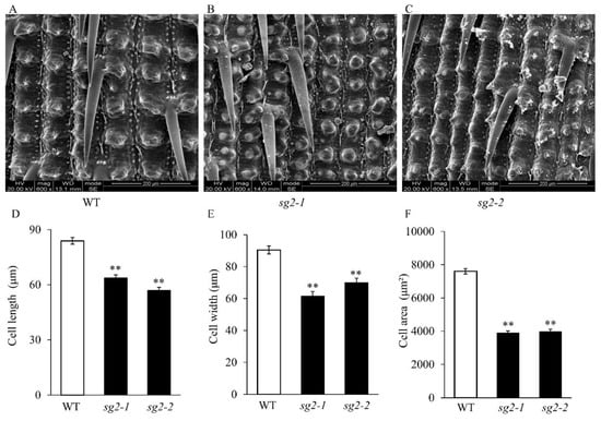 Histological comparison of the spikelet hulls between WT and sg2 mutants. (A–C) Outer epidermal cells of the lemma observed by SEM. Scale bar, 200 μm. (D–F) Comparison analysis of the cell length, cell width and cell area in the outer epidermal cells. Data are given as means ± SD. Student’s t-test was used to generate the p values; ** indicate p < 0.01.