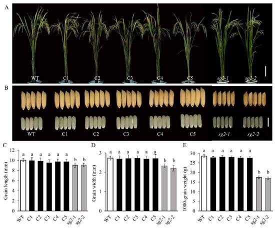Phenotypic characterizations of complementation lines. (A) Plant comparison of wild-type (WT), complementation lines at the maturity stage. C1–C5 represent the five complementation transgenic lines. Bar = 20 cm. (B) Morphology of grain shape in WT, complementation lines. Bar = 2 mm. (C–E) Statistical data of the grain length (C), grain width (D), 1000-grain weight (E) in WT and complementation lines. Data are given as means ± SD. Different letters indicate statistically significant differences at the p = 0.01 level by Student’s t-test.