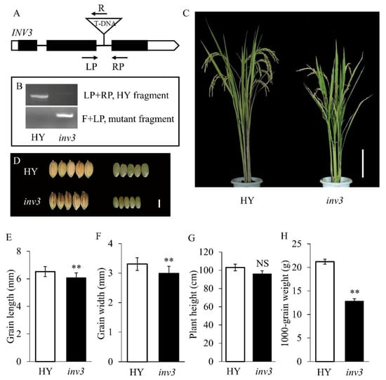 Phenotypic characterizations of INV3 T-DNA insertion mutant. (A) T-DNA insertion site of the inv3 mutant. The triangle indicates the T-DNA insertion site in the inv3 mutant. Black boxes, lines and white boxes represent exons, introns and the untranslated regions, respectively. (B) Gel data showing the presence of HY and inv3 alleles. (C) Plant comparison of HY, inv3 mutant at the maturity stage. Bar = 10 cm. (D) Morphology of grain shape in HY, inv3 mutant. Bar = 2 mm. (E–H) Statistical data of the grain length (E), grain width (F), plant height (G) 1000-grain weight (H) in WT and inv3 mutant. Data are given as means ± SD. Student’s t-test was used to generate the p values; ** and NS indicate p < 0.01 and no significant differences, respectively.