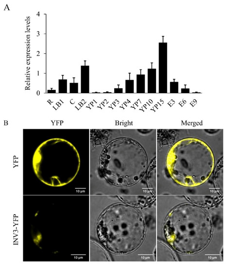 2.5. OsINV3 Expression Pattern and Protein Subcellular Localization