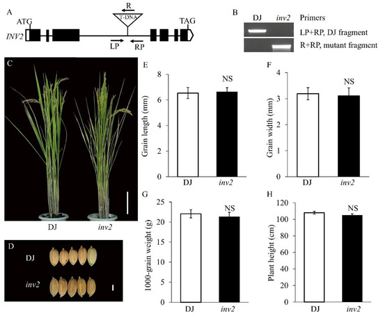 Phenotypic characterizations of INV2 T-DNA insertion mutant. (A) T-DNA insertion site of the inv2 mutant. The triangle indicates the T-DNA insertion site in the inv2 mutant. Black boxes, lines and white boxes represent exons, introns and the untranslated regions, respectively. The start codon (ATG) and the stop codon (TAG) are indicated. (B) Gel data showing the presence of DJ and inv2 alleles. (C) Plant comparison of DJ, inv2 mutant at the maturity stage. Bar = 10 cm. (D) Morphology of grain shape in DJ, inv2 mutant. Bar = 2 mm. (E–H) Statistical data of the grain length (E), grain width (F), plant height (G), and 1000-grain weight (H) in DJ and inv2 mutant. Data are given as means ± SD. Student’s t-test was used to generate the p values; NS indicate no significant differences.