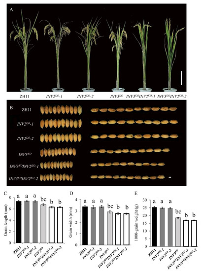 Genetic interactions of INV2 and INV3. (A) Plant comparison of ZH11, INV2KO-1, INV2KO-2, INV3KO, INV3KOINV2KO-1, and INV3KOINV2KO-2 at maturity stage. Bar = 25 cm. (B) Morphology of grain shape in ZH11, INV2KO-1, INV2KO-2, INV3KO, INV3KOINV2KO-1, and INV3KOINV2KO-2. Bar = 2 mm. (C–E) Statistical data of the grain length (C), grain width (D), 1000-grain weight (E) in ZH11, INV2KO-1, INV2KO-2, INV3KO, INV3KOINV2KO-1, and INV3KOINV2KO-2. Data are given as means ± SD. Different letters indicate statistically significant differences at the p = 0.01 level by Student’s t-test.