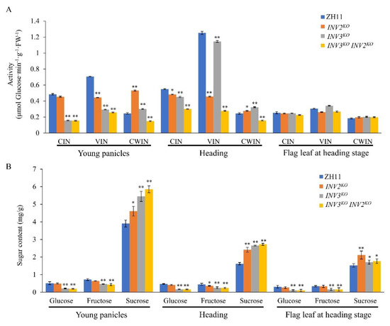 Comparisons of invertase activity and sugar content of ZH11, INV2KO, INV3 KO and INV3KOINV2KO. Activities of three invertase isoforms (CIN, VIN, CWIN) (A) and sugar content (B) in young panicles, heading and flag leaf at heading stage of ZH11, INV2KO, INV3KO, and INV3KOINV2KO. Data are given as means ± SD. Student’s t-test was used to generate the p values; **, * indicate p < 0.01, p < 0.05, respectively.