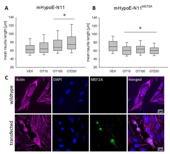 Treatment of mouse hypothalamic MEF2A-deficient mHypoE-N11 cells (see Table 1), with increasing concentrations (10, 100 and 250 nM) of OT overnight, led to a dose-dependent increase in neurite length, which reached significance in the 100 and 250 nM treatment group, but not in the 10 nM group (Figure 1A). Statistical analyses for all figures are summarized in the Supplementary Materials, including details on p values and effect sizes.