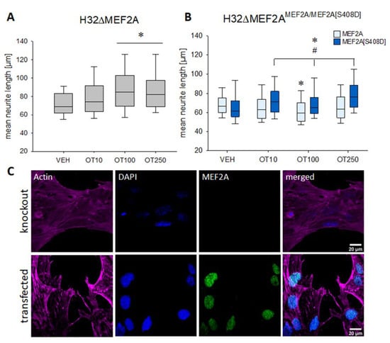Effects of OT on neuronal morphology in the rat hypothalamic cell line H32. (A) Incubation of H32ΔMEF2A cells with 100 or 250 nM OT leads to a significant neurite elongation. n = 100 cells per treatment; * p < 0.001 vs. VEH. (B) H32ΔMEF2A cells were retransfected with wild-type MEF2A and a mutant version MEF2A[S408D], which mimics a permanently phosphorylated and therefore inactive MEF2A. The wild-type MEF2A generated OT-induced neurite retraction, whilst the mutant MEF2A lacked the ability to induce neurite retraction. Instead, the mutant response to OT resembled the MEF2A knockout cells. n = 100 cells per treatment; two-way ANOVA; * p < 0.031 treatments vs. VEH within the same group; # p < 0.002 groups (wild-type vs. mutant) within the same treatment. (C) Representative images of immunofluorescence labelling for MEF2A. Images were sequentially recorded for F-actin (Phalloidin, red, first column), chromatin (DAPI, blue, second column), and MEF2A (green, third column). Merged images are shown for each row in the fourth column. Labels left to the columns indicate the respective cell type (knockout vs. transfected).