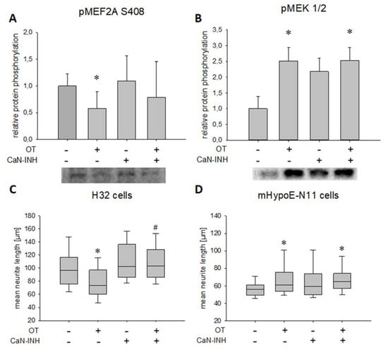 Effect of OT stimulation and calcineurin inhibition on phosphorylation of S408 of MEF2A and MEK1/2 as well as on the median neurite length in H32 cells. (A) Relative MEF2A S408 phosphorylation analyzed by Western blotting in whole cell lysate after treatment with VEH and OT, in the presence or absence of a CaN inhibitor (CaN-INH), with representative blot below. Overnight incubation of H32 wild-type cells with 100 nM OT led to a significant dephosphorylation of MEF2A at S408 compared to VEH treated cells (one-way ANOVA, p = 0.056; independent t-test VEH vs. OT, p = 0.006). This effect is dependent on CaN activity, as it is reversed to basal by a CaN-INH. The inhibitor without OT had no effect on MEF2A phosphorylation. n = 6 per treatment. (B) Relative phosphorylation of MEK1/2 analyzed by Western blotting in whole cell lysate after treatment with VEH and OT, in the presence or absence of a CaN inhibitor, with representative blot picture below. Treatment of the cells with 100 nM OT overnight led to a significant phosphorylation of MEK1/2 compared to VEH. Statistical analysis using one-way ANOVA revealed no significant effect of the inhibitor treated cells, but a significant phosphorylation of MEK1/2 when cells were treated with OT and the CaN-INH. n = 6 per treatment; * p < 0.05 vs. VEH. (C) In H32 cells, 100 nM of OT led to a significant retraction compared to VEH, while inhibition of CaN resulted in elongation of neurites overnight compared to VEH and OT. Combining the OT treatment with a CaN-INH increased the neurite length significantly. n = 100 per treatment; * p < 0.001 vs. VEH-treated cells; # p < 0.001 vs. OT-treated cells. (D) Incubation of mHypoE-N11 cells with 100 nM OT overnight led to an increased neurite length. Inhibition of CaN had no effect on the neuronal morphology, in line with the absent MEF2A expression in this cell line. n = 50 per treatment; * p < 0.05 vs. VEH-treated cells.