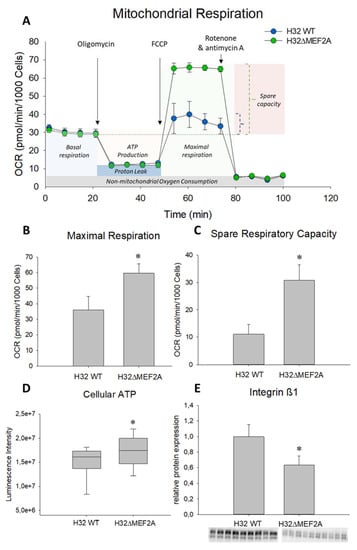 The oxygen consumption rate (OCR) of intact H32 and H32ΔMEF2A cells was measured with the Agilent Seahorse XF Cell Mito Stress Test Kit (Agilent Technologies, Waldbronn, Germany) according to the manufacturer’s protocol. The live cell assay monitors OCR in real time and assesses the key parameters of mitochondrial function. Mitochondrial stress compounds used for this assay are oligomycin (1 µM), carbonyl cyanide-4 (trifluoromethoxy) phenylhydrazone (FCCP; 2 µM), and rotenone/antimycin A (1 µM). On the day before the measurement, 20 × 103 cells were seeded in matrigel-coated XFp 8-well miniplates (Agilent Technologies, Waldbronn, Germany) at 37 °C, humidified air and 5% CO2. Cartridges were prepared according to the provided protocol. The obtained values were normalized to the cell number present in the region of interest, reflecting the field of measurement by ImageJ. Data was analyzed using the WAVE software (Agilent Technologies, CA, USA) according to the manufacturer’s protocol.