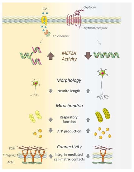 In recent publications, OT has been considered as a potential treatment for the alleviation of adverse psychiatric traits, e.g., ASD-related symptoms [,,,]. The effects range from improving social skills in autistic children [,] to increased reciprocal trust in adult healthy probands []. However, the underlying molecular mechanism of the OT’s alleviating properties on the symptoms of ASD are not fully understood. Considering the cellular changes apparent in ASD patients, we focused on the main parameters of cellular morphology, mitochondrial function and neuronal connectivity in this study, providing evidence for MEF2A as central regulator of those processes (Figure 5).