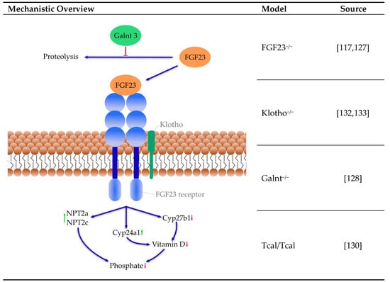 Galnt3: Patients with mutations in Galnt3 suffer from hyperphosphatemia and extensive calcium depositions [129]. Results from mice models are contradicting: Galnt3−/− mice have hyperphosphatemia and increased FGF23 expression, although secretion of intact FGF23 is impaired, but show no sign of abnormal calcification [128]. In contrast, Tcal/Tcal mice, which feature a missense mutation in the Galnt3 gene, feature hyperphosphatemia and extensive ectopic calcification [130]. In Galnt3−/− mice, breeding with FGF23 transgenic mice can increase the amount of intact FGF23 and reduce hyperphosphatemia [131].