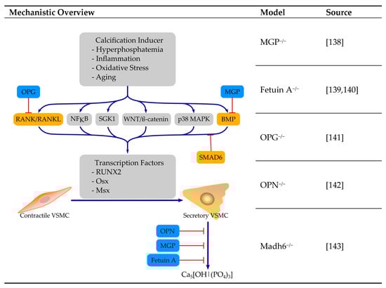 Cardiovascular disease plays a pivotal role in global morbidity and mortality. One main cause is alterations of the vessel structure, such as atherosclerosis and arteriosclerosis. Arteriosclerosis describes the literal calcification of the media vessel wall of arteries, and atherosclerosis is mainly caused by lipid accumulation and formation of atheromatous plaques in the intima of arteries, with secondary calcification occurring. The calcification in both entities is believed to share underlying mechanisms. Until now, the treatment of vascular calcification (VC) has been limited to management of risk factors with attempts at regulating the impaired calcium–phosphate metabolism. However, VC is an active process which the mechanisms of bone formation, inhibitors of mineralization and local alterations of the vessel wall take part in [1]. One pivotal point of VC is probably the vascular smooth muscle cell (VSMC) with its phenotype changes ending in vessel mineralization [2]. The phenotype shift of VSMC seems to be induced by a variety of conditions such as inflammation [3], reactive oxygen species (ROS) [4,5] and senescence [6]. Aside from differentiated VSMC, other cell types are associated with VC. Mesenchymal osteoprogenitor cells, hematopoietic progenitor cells, endothelial progenitor cells and myeloid cells are circulating cells that bear osteogenic and calcifying potential [7,8]. Not only circulating cells, but also abnormal metabolic conditions such as uremia in the context of chronic kidney disease (CKD) [9], impaired bone metabolism with hyperphosphatemia [10], hypercalcemia and diabetes mellitus type 2 [11,12] lead to medial located calcification, depicting the idea of a systemic disease. The idea of a systemic disease is further supported by decreasing levels of endogenous inhibitors of ectopic calcification like fetuin-a, matrix gla protein (MGP) and inorganic pyrophosphate (PPi) being part of the pathogenesis [13,14]. Under calcifying conditions with high levels of phosphate and calcium in blood, not only cells but also their deposits act as a nidus for the process of mineralization. In order to reduce the intracellular calcium–phosphate burden, VSMC, for example, can form matrix vesicles or apoptotic bodies. Both of these extracellular deposits serve as a nucleation site for hydroxyapatite and therefore promote calcification [15,16,17]. Aside from this, degradation of the extracellular matrix (ECM) by matrix metalloproteinases (MMP) facilitates hydroxyapatite deposition and even osteoblastic transdifferentiation of VSMC [18]. This vast variety of probably influencing factors and different components in the development of VC reflect, at least in part, the variety of research models and vice versa. As long as the underlying mechanisms of VC are not fully understood and treatment options are lacking, evaluation methods and research models will emerge. This review summarizes currently available cell and animal models to study the molecular processes of VC. The assessment and research methods for VC in humans are summarized elsewhere [19].