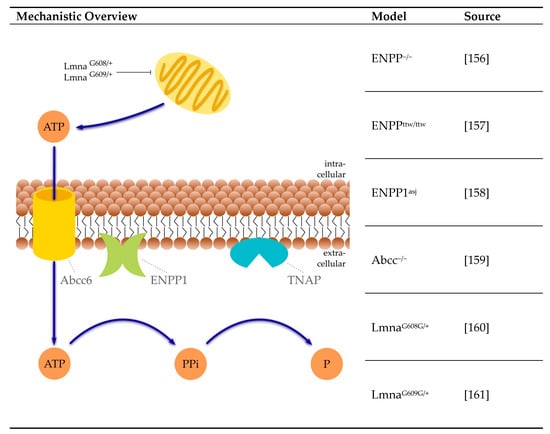 Lamin A/C (LMNA): Mutations in the LMNA gene result in the synthesis of progerin, a splicing isoform of the precursor protein prelamin A [166]. Alternatively, a mutation in ZMPSTE24 (farnesylated protein-converting enzyme 1) can result in an abnormal accumulation of prelamin A [166]. In G608G transgenic mice (LmnaG608G/+), pathological changes in the media layer of large vessels e.g., VSMC loss and calcification [160] have been reported. In heterozygous LmnaG609G/+ mice, increased medial calcification of the aortic arch and thoracic aorta, as well as reduced PPi levels, were found, resulting from impaired mitochondrial ATP synthesis [161].