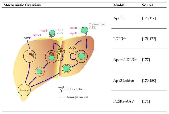 Hyperlipidemia in one of the main triggering factors in the pathophysiology of human atherosclerosis. In mice, the lipoprotein profile significantly differs from humans [167,168]. Mice are lacking the cholesteryl ester transfer protein, an enzyme that transfers cholesterol from high-density lipoprotein (HDL) to apolipoprotein B-containing lipoproteins as low-density lipoprotein (LDL) and very low-density particles (VLDL) [169]. In addition, mice also have bile acid compositions that differ from humans [168,170], affecting the enterohepatic cycle of cholesterol [170]. Several models for the disruption of lipid metabolism exist e.g., including LDL receptor (LDLR)−/−, apolipoprotein E (ApoE)−/−, LDLR and ApoE double knockout, ApoE3 Leiden transgenic mice and proprotein convertase subtilisin/kexin type 9 (PCSK9) gain of function models (Figure 4). Additional existing models are reviewed in detail elsewhere [167].
