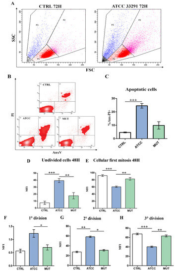 As shown in (Figure 1D–H), efficiency of CDT in G2-M blocking was investigated by means of carboxyfluoresceinsuccinimidyl ester (CFSE), a fluorescent dye that can measure cell proliferation using flow cytometry. Results at 48 h showed that the C. jejuni ATCC 33291 lysate exerted maximally this blocking-effect, showing percentages of undivided cells higher than cells treated with the lysate from the mutant strain. Moreover, via CFSE fluorescence cytometric evaluation, the efficiency of CDT in G2-M blocking was calculated at 72 h (Figure 1F–H)). Bar graphs regarding the first, second, and third division indicated that the typical CDT effect on DNA not only persisted after 72 h from lysate administration, but also became more evident, particularly for the C. jejuni ATCC 33291 lysate.