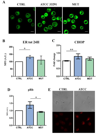 Evaluation of ER involvement by confocal microscopy, flow cytometry, and RT-PCR analyses. (A) Single confocal optical sections of ER Tracker MFI of untreated cells and treated U937 at 24 h. Bars: 10 µM. (B) Statistical histograms of ER Tracker MFI at 24 h, quantitated by flow cytometry. Each value was converted to arbitrary units (A.U.), setting the control as 100. Each value is expressed as a mean ± SD (results from n ≥ 3 independent experiments). (C) Evaluation of C/EBP-homologous protein (CHOP) expression in U937 cells after 24 h from lysate administration. Welch’s unpaired t test revealed: ** p = 0.009 for CTRL vs. ATCC 33291. Evidence of pRb modulation by flow cytometry and confocal microscopy. (D) Statistical histograms of pRb intracellular content in U937 cells at 72 h. Each value was converted to arbitrary units (A.U.), setting the control as 1. Each value was expressed as a mean ± SD (results from n ≥ 3 independent experiments). The asterisk denotes a statistically significant difference (* = p < 0.05) between strains. (E) Single confocal optical sections of pRb MFI of untreated cells and U937 cells preincubated with the C. jejuni ATCC 33291 lysate for 72 h. Bars: 10 µM.