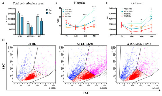 Evaluation of cell count, cell death, and cell size induced by lysates and rapamycin (RM) administration (A) Absolute count calculated after 72 h from lysate administration in total cells. Each value is expressed as an absolute number ± SD/mL (results from n ≥ 3 independent experiments). (B) Trends of percentage of AnxV-PI positive cells calculated from T0 to 72 h from lysate administration, with (RM+) or without RM (RM-). Each value is expressed as a percentage ± SD (results from n ≥ 3 independent experiments). Asterisks denote a statistically significant difference (***= p < 0.001) between strains. (C) Trends of forward light scatter (FSC) values for each treatment during the time course from the starting time point (T0) to 72 h. Each value is expressed as a mean ± SD (results from n ≥ 3 independent experiments). Asterisks denote a statistically significant difference (* = p < 0.05) between strains. (D) Dot plots of scatter characteristics (FSC vs. side scatter (SSC)) of U937 control cells (CTRL) and C. jejuni ATCC 33291 U937 treated cells with (ATCC 33291 RM+) or without (ATCC 33291) rapamycin at 72 h. Cellular distension (events in blue) is well appreciable for C. jejuni ATCC 33291 U937 treated cells; rapamycin, on the other hand, reduces the amount of distended cells. The gates are drawn around roughly the same areas of Figure 1.