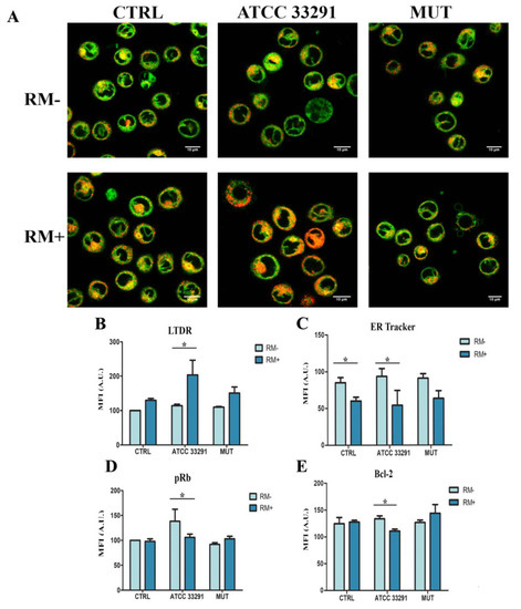 Concomitant evaluation of ER tracker and LysoTracker Deep Red (LTDR) fluorescence by qualitative analysis (confo) (A) Single confocal optical sections of ER Tracker (in green) and LTDR (in red) of untreated U937 cells (CTRL) and U937 cells preincubated with lysates after 72 h of treatment with and without RM. Where present, co-localization is shown in yellow-orange. Lower pictures show U937 cells pre-treated with RM for 2 h before lysate administration. Bars: 10 µM. Contemporaneous evaluation of ER tracker and LTDR fluorescence by quantitative analysis (flow cytometry). (B,C) For investigated parameters, ER (by ER Tracker staining) and lysosomes (by LTDR staining), a comparison between RM- and RM+ values was carried out for each experimental condition at 72 h. The pRb and bcl-2 expression modulated by lysates (light blue) and lysates + RM (dark blue). (D) Statistical histograms of MFI of pRb were calculated after 72 h from lysate administration in distended cells with and without RM. Each value was converted to arbitrary units (A.U.), setting the control as 100. (E) Statistical histograms of MFI of bcl-2 was calculated after 72 h from lysate administration in distended cells with and without RM. Each value is expressed as a mean ± SD (results from n ≥ 3 independent experiments). Asterisks denote a statistically significant difference (* = p < 0.05) between strains.