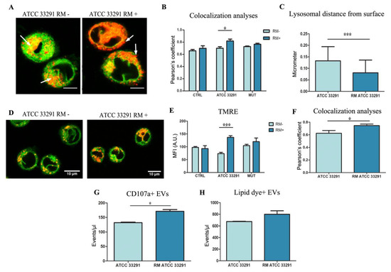 Confocal analyses: ER morhology and extension and its relationship with lysosomes. (A) Single confocal optical sections of ER Tracker (in green) and LTDR (in red) of ATCC33291 lysate treated U937 cells and U937 cells preincubated with lysate and treated by RM, after 72 h. Co-localization is shown in yellow-orange and white arrows indicate the positioning of lysosomes, from a perinuclear area (ATCC 33291 RM-) to a peripheral distribution (ATCC 33291 RM+). Bars: 10 µM. In (B), Pearson’s coefficient, able to quantitate co-localization, specifically induced by RM in ATCC 33291 lysate treated cells. Asterisks denote a statistically significant difference (* = p < 0.05) between strains. (C) Lysosome distance from surface calculated by ImageJ. Calculation performed on 30 cells for each experiment (n = 3). Only lysosomes with a puncta and definite morphology were counted, from a minimum of 10/cell to a maximum of 30/cell. Mitochondria membrane potential and ER–mitochondria interactions. Asterisks denote a statistically significant difference (*** = p < 0.001) between strains. (D) Single confocal optical sections of ER Tracker (in green) and TMRE (in red) of ATCC33291 lysate treated U937 cells and U937 cells preincubated with lysate and treated by RM, after 72 h. Red fluorescence from mitochondria and their puncta are clearly increased in RM+ cells. Bars: 10 µM. (E) TMRE MFI values of RM- and RM+ lysate-treated U937 cells. Asterisks denote a statistically significant difference (*** = p < 0.001) between strains. (F) Pearson’s coefficient, able to quantitate TMRE/ER-tracker co-localization, specifically induced by RM in ATCC 33291 lysate treated cells. Total extracellular vesicles (EVs) and EVs from lysosome exocytosis. Asterisks denote a statistically significant difference (* = p < 0.05) between strains. (G) Flow cytometric quantitation of CD107a + EVs with (RM ATCC 33291) or without (ATCC 33291). Asterisks denote a statistically significant difference (* = p < 0.05) between strains. (H) Flow cytometric quantitation of lipid dye + EVs with (RM ATCC 33291) or without (ATCC 33291).