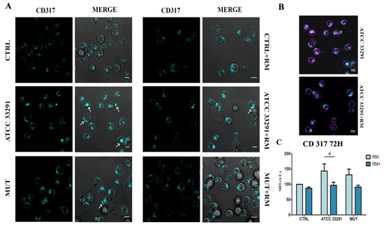 CD317/tetherin is an organizer of membrane microdomains [64]. CD317/tetherin is an antigen localized within lipid rafts on the cell surface, in the TGN, and/or within recycling endosomes [17]. The different positioning of lysosomes and the extracellular vesicle release, together with its involvement during infections, prompted us to investigate the expression and the distribution of CD317 in our experimental model. As showed in Figure 6C,D, in infected U937, we found an important increase in CD317 expression after 48 h of treatment, whereas RM significantly prevented this effect. Confocal analyses confirm the cytometric data highlighting also a redistribution of CD317 on the cell surface. We observed the formation of a large number of CD317 clusters, in particular in ATCC 33291 treated samples (Figure 6C), whereas in the control condition, this surface antigen appeared to spread on the cell membrane. A similar phenomenon was also observed by other researchers that demonstrated that HIV-1 viral proteins bring to the reorganization of plasma membrane microdomains inducing the coalescence of lipid rafts and tetraspanin-enriched microdomains [65]. As evident in Figure 6C, RM pre-treatment avoided CD317 clusterization and coalescence, appearing similar to the control condition, also in the presence of lysates. It is clear that RM, by modifying the levels and distribution of CD317, plays a role in the organization of lipids in the plasma membrane and in the distribution of proteins that are confined to lipid rafts [66].
