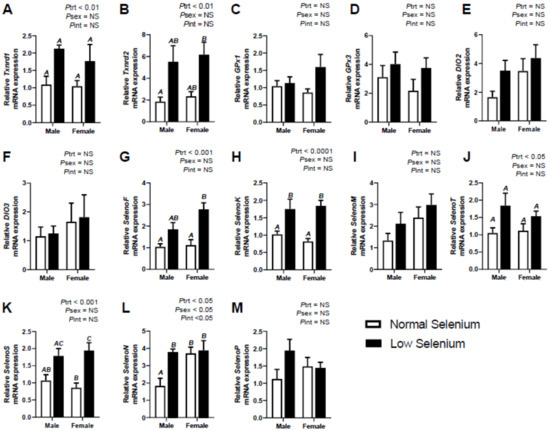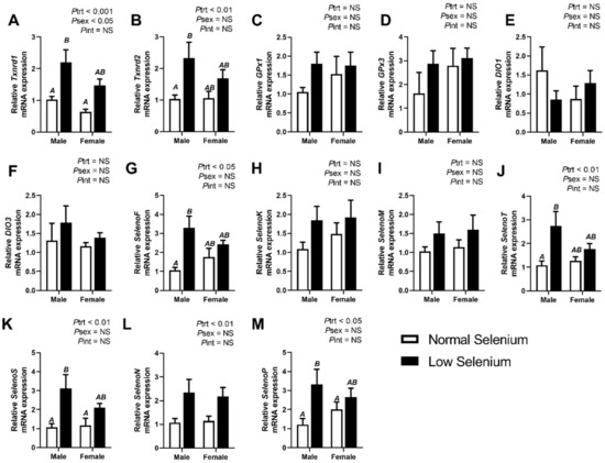 Effects of selenium deficiency on selenoprotein expression in fetal liver at E18.5. Expression in male and female fetal livers, at E18.5, of; (A) thioredoxin reductase 1, (B) thioredoxin reductase 2, (C) glutathione peroxidase 1, (D) glutathione peroxidase 3, (E) deiodinase 1, (F) deiodinase 3, (G) selenoprotein F, (H) selenoprotein K, (I) selenoprotein M, (J) selenoprotein T, (K) selenoprotein S. (L) selenoprotein N and (M) selenoprotein P. Data are mean ± SEM and analysed by two-way ANOVA with treatment (Ptrt) and sex (Psex) as major factors. Pint represents the interaction between treatment and sex. Significance was determined as p < 0.05. If a major effect of treatment, sex or an interaction between treatment and sex was identified, then a Sidak posthoc test was performed. Significant differences between groups as detected by posthoc analysis are denoted by different letters where “A” is different from “B”, but not “AB”. The groups are Normal male, n = 6 (6 animals from 6 separate litters); Low male, n = 6 (from 6 separate litters); Normal female, n = 6 (from 6 separate litters); Low female, n = 6 (from 6 separate litters).