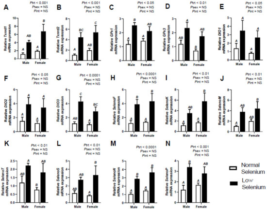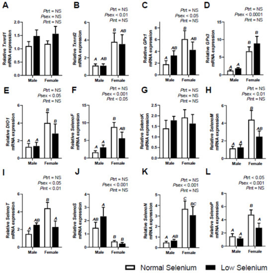Effects of selenium deficiency on selenoprotein expression in offspring liver at PN180. Expression in male and female offspring livers, at PN180, of; (A) thioredoxin reductase 1, (B) thioredoxin reductase 2, (C) glutathione peroxidase 1, (D) glutathione peroxidase 3, (E) deiodinase 1, (F) selenoprotein F, (G) selenoprotein K, (H) selenoprotein M, (I) selenoprotein T, (J) selenoprotein S, (K) selenoprotein N and (L) selenoprotein P. Data are mean ± SEM and analysed by two-way ANOVA with treatment (Ptrt) and sex (Psex) as major factors. Pint represents the interaction between treatment and sex. Significance was determined as p < 0.05. If a major effect of treatment, sex or an interaction between treatment and sex was identified, then a Sidak posthoc test was performed. Significant differences between groups as detected by posthoc analysis are denoted by different letters where “A” is different from “B” which is different from “C”. “A” is not different from “A” or “AB”, while “B” is not different from “B”, “AB” or “BC”. The groups are Normal male, n = 8 (8 animals from 8 separate litters); Low male, n = 8 (from 8 separate litters); Normal female, n = 8 (from 8 separate litters); Low female, n = 6 (from 6 separate litters).