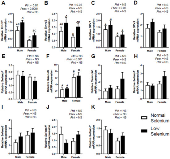 Effects of selenium deficiency on selenoprotein expression in offspring kidneys at PN180. Expression in male and female offspring kidneys, at PN180, of; (A) thioredoxin reductase 1, (B) thioredoxin reductase 2, (C) glutathione peroxidase 1, (D) glutathione peroxidase 3, (E) selenoprotein F, (F) selenoprotein K, (G) selenoprotein M, (H) selenoprotein T, (I) selenoprotein S, (J) selenoprotein N and (K) selenoprotein P. Data are mean ± SEM and analysed by two-way ANOVA with treatment (Ptrt) and sex (Psex) as major factors. Pint represents the interaction between treatment and sex. Significance was determined as p < 0.05. If a major effect of treatment, sex or an interaction between treatment and sex was identified, then a Sidak posthoc test was performed. Significant differences between groups as detected by posthoc analysis are denoted by different letters where “A” is different from “B” which is different from “C”. “A” is not different from “A” or “AB”, while “B” is not different from “B”, “AB” or “BC”. The groups are Normal male, n = 8 (8 animals from 8 separate litters); Low male, n = 8 (from 8 separate litters); Normal female, n = 8 (from 8 separate litters); Low female, n = 6 (from 6 separate litters).