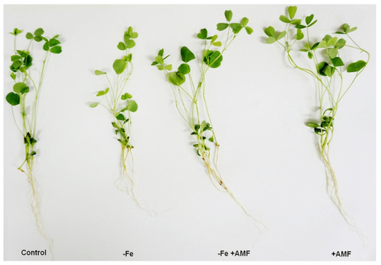 Changes of alfalfa phenotype. Fe deficiency (−Fe)-induced chlorosis, along with role of Arbuscular mycorrhizal fungi (AMF) to alleviate Fe deficiency retardation in alfalfa. Photograph of alfalfa plants were taken after 4 weeks of treatment.