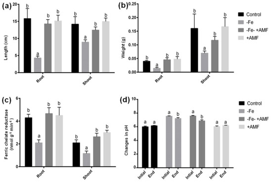 AMF supplementation showed colonization with clear hyphae and vesicle in the root of alfalfa plants (Supplementary Figure S1). In this study, Fe deficiency resulted in a significant change of the alfalfa phenotype along with the length and dry weight of both root and shoot compared to the non-treated controls (Figure 1 and Figure 2). Plant supplemented with AMF showed a significant increase in length as well as their root and shoot biomass compared to the plants cultivated under Fe deficiency (Figure 2a,b). Furthermore, ferric chelate reductase (FCR) activity significantly decreased following Fe deficiency in either root or shoot compared to non-treated controls. However, AMF supplied with or without Fe deficiency (+AMF, −Fe+AMF) showed a significant enhancement of ferric chelate reductase activity in both root and shoot compared to Fe-deficient (−Fe) plants (Figure 2c). In addition, the pH of the cultivation media measured at the beginning and the end of cultivation showed no significant changes. However, the bicarbonate induced Fe deficiency resulted in a significant decrease in pH level in the presence or absence of AMF, although the decrease was greater under AMF supplementation (Figure 2d).