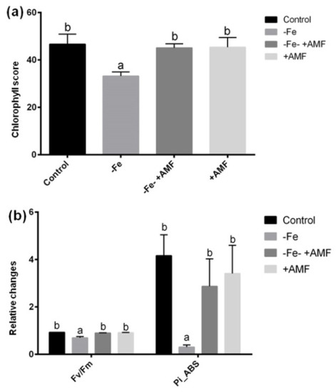 We measured SPAD and OJIB data to determine the effect of AMF on preventing photosynthesis damage caused by Fe deficiency. Fe deficiency caused a significant decline of chlorophyll score along with Fv/Fm (quantum efficiency of photosystem II) and Pi_ABS (photosynthesis performance index) due to Fe deficiency compared to controls that were restored in alfalfa plants in response to AMF addition (Figure 3a,b). Plants supplemented with AMF grown under control conditions similar to SPAD and Fv/Fm and Pi_ABS data to that of controls.