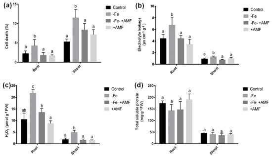 A number of stress indicators were checked to observe whether AMF mitigates the Fe-deficiency induced stresses in alfalfa. In this study, cell death (%), electrolyte leakage, and H2O2 concentration significantly enhanced in response to Fe deficiency in both root and shoot of alfalfa plants compared to controls (Figure 4a–c). However, the addition of AMF with or without Fe deficiency (+AMF, −Fe+AMF) resulted in a significant decrease in these biochemical stress indicators compared to Fe-stressed (−Fe) plants. Although the reduction of these stress indicators was greater in plants cultivated with AMF supplementation (+AMF). Total soluble protein content did not show any significant changes in either root or shoot among the treatments (Figure 4d).