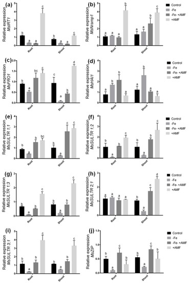 Quantitative expressions of candidate genes in alfalfa root and shoot in response to Fe deficiency with or without AMF. (a) Response of MsIRT1, (b) MsNramp1, (c) MsFRO1, (d) MsHAI1, (e) MsSULTR1;1, (f) MsSULTR1;2, (g) MsSULTR1;3, (h) MsSULTR2;1, (i) MsSULTR 3;1, and (j) MsZIP genes. The level of relative gene expression was analyzed using the dd−∆Ct method, and MsActin was used as internal control. Data represent means ±SD (n = 3). Different letters above the error bar indicate significant difference at p < 0.05 level.