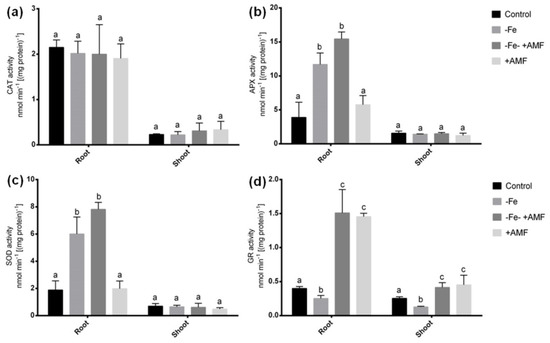 Several antioxidant enzymes were determined to evaluate whether AMF does possess antioxidant defense to scavenge ROS damage induced by Fe deficiency in alfalfa. In this study, we did not see any significant changes in CAT activity in either root or shoot among the treatments (Figure 6a). APX and SOD activities significantly increase in roots of plants cultivated under Fe deficiency with or without AMF supplementation (−Fe, −Fe+AMF) in the culture compared to the non-treated controls (Figure 6b,c). Although these activities were comparably higher in root after the addition of AMF with Fe deficient condition. Plant cultivated solely with AMF showed a similar tendency of APX and SOD activities to that of controls in roots. In shoot, APX and SOD enzymes did not show any changes among the treatments. Further, Fe deficiency resulted in a significant decrease in GR activity in both root and shoot of alfalfa compared to non-treated controls. However, GR activity showed a remarkable increase in both root and shoot due to AMF supplementation with or without Fe deficiency (+AMF, −Fe+AMF) compared to the plants grown without AMF treatments (Figure 6d).