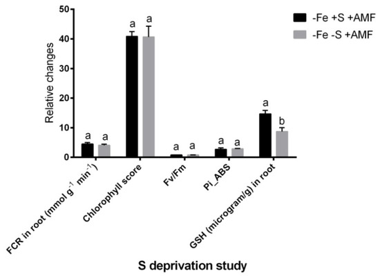 We measured a few key parameters in the absence and presence of S in the nutrient media to see whether S deprivation affects AMF-mediated mitigation of Fe-deficiency symptoms in alfalfa. In this study, alfalfa plants grown under Fe deficiency with S and AMF supplementation (−Fe+S+AMF), showed no significant changes in root FCR, SPAD score, Fv/Fm and Pi_ABS compared to the plants grown in similar growth conditions without S (Figure 7). However, S deprivation under Fe deficiency with AMF (−Fe-S+AMF) supplementation showed a significant decrease of glutathione concentration in alfalfa root compared to the Fe-deficient with S supply having AMF supplementation.