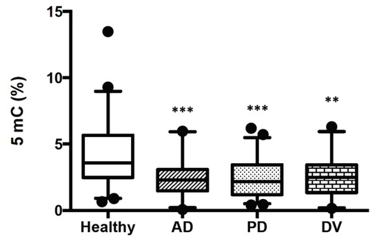 5mC levels in blood DNA samples from healthy subjects and patients with AD, PD or DV. DNA global methylation was determined with an Enzyme-Linked ImmunoSorbent Assay (ELISA)-like colorimetric assay as described in Material and Methods. The study includes 40 patients with AD, 35 with PD, 26 with DV and 40 healthy controls. Data are shown in a box-plot graphic. Statistical significance between groups was calculated with ANOVA and the Bonferroni test and is shown as ** p < 0.01 and *** p < 0.001.