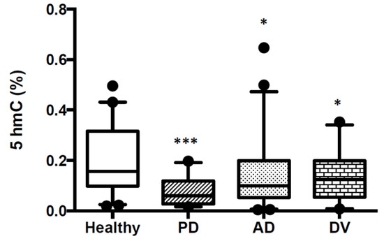 There is less bibliography about the role of 5hmC as an epigenetic mark. It is not only an intermediate product produced in the removal process of 5mC but also an epigenetic modification by itself, regulating gene expression. 5hmC is involved in neurodevelopment and also in neurodegenerative diseases. For these reasons, we measured DNA 5hmC levels in buffy coat samples from 40 healthy subjects and 47 patients with AD, 30 with PD and 21 with DV. Characteristics of patients are shown in Table 1. 5hmC values were found to be significantly lower in the three pathologies compared to healthy subjects. However, the reduction was higher in DNA from Parkinson’s disease patients, with a medium value of 0.08% ± 0.01 versus the 0.2% ± 0.02 obtained in healthy subjects. In DNA samples from Alzheimer’s disease or Vascular Dementia, 5hmC values were 0.15% ± 0.02 and 0.13 ± 0.02, respectively (Figure 2). The histograms of the data obtained in AD, PD and DV groups are shown in Figure S2 and normality test results in Figure S3.