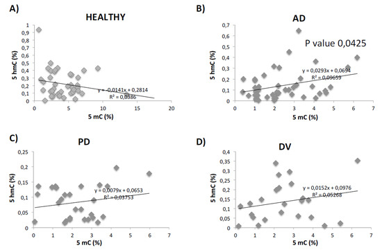 Correlation analysis between 5mC and 5hmC levels. Regression analysis of 5mC and 5hmC values in healthy (A), AD (B), PD (C) and DV (D) groups. p-values are also indicated in the graphics when this value is significant. p-value is indicated in the figures as * p < 0.05.