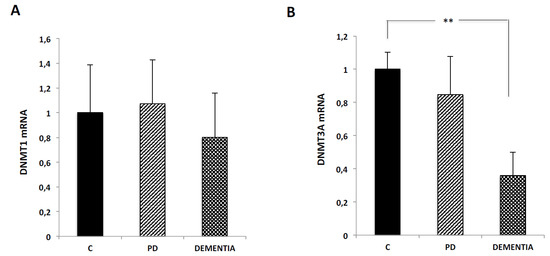 DNMT1 is responsible for maintaining methylation patterns after DNA replication, being responsible for the inheritance of methylation marks. We did not detect any significant change in DNMT1 expression (Figure 4A) between healthy subjects and PD or Dementia groups.